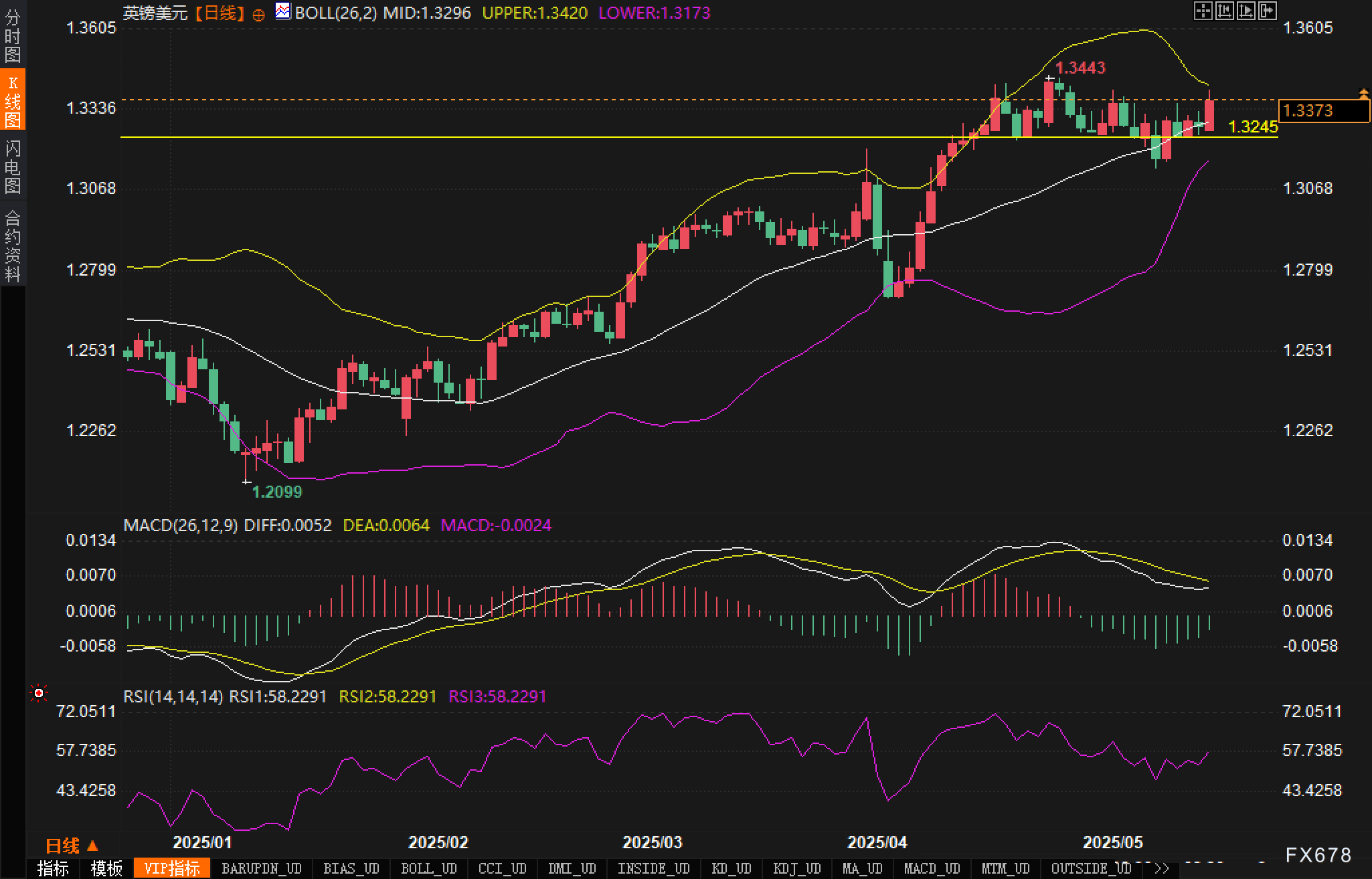 布林带指标显示,中轨位于1.3296,上轨位于1.3420,下轨位于1.3173。价格在布林带上半部分运行,表明上行趋势强劲。近期价格在1.3245形成了短期支撑,这一水平与4月初形成的前期高点附近吻合,显示出有效的价格记忆特性。