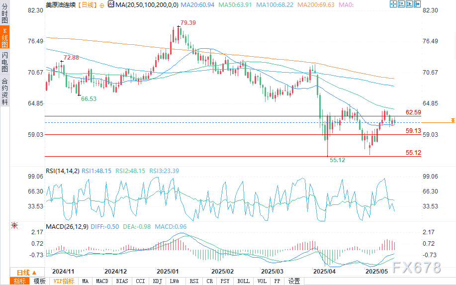 周一(5月19日)欧盘时段,WTI原油盘中期货走低超过1%,交易员面临关键技术阻力位与不断恶化的宏观背景。价格正测试62.59美元(50%回撤位)和50日移动平均线(近63.10美元)的上方阻力。这些水平对价格形成压制,若决定性突破上方,可能触发更剧烈的上行行情。与此同时,近期抛售压力将价格拉低至60.00美元,但技术分析人士正关注59.13美元的枢轴支撑位这一真正下行目标。