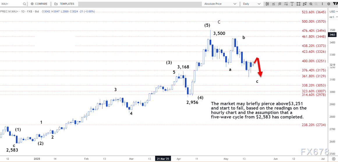 分析师指出,金价正处于c浪走势中,预计与a浪走势大致相同,将上涨至3286美元。当前由3251美元阻力位引发的回调可能限制在3,206美元。