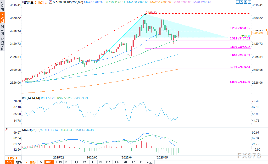 金价正接近3288美元的20日简单移动平均线和今年1月至4月年初至今走势的23.6%斐波那契回撤位3291美元。