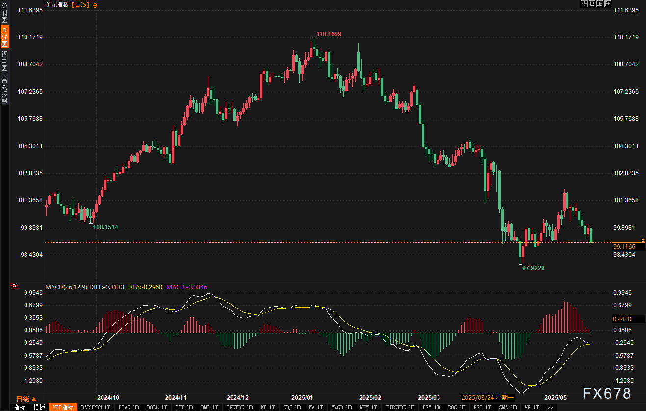 美元指数本周下跌1.85%,收于99.09,创三周最低水平。周初,美元受穆迪下调美国主权信用评级影响,市场对美国36万亿美元债务及特朗普减税法案的担忧加剧,导致美元全线走弱。周五,特朗普威胁对欧盟加征50%关税及对非美国生产的苹果、三星手机加征25%关税,进一步引发市场抛售美元情绪。美元指数枢轴点位于99.83,支撑区间为98.877-100.893,显示短期内仍有下行压力。