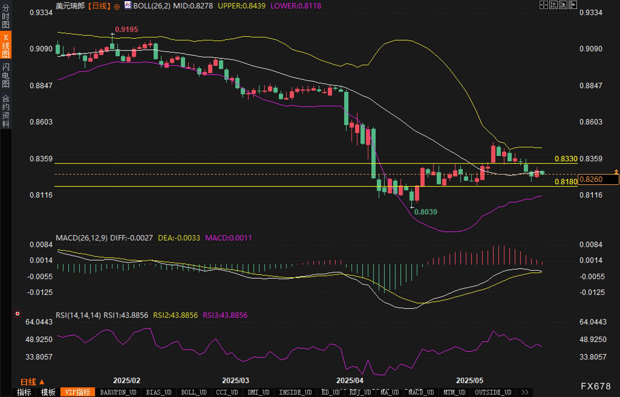 短期展望:预计美元兑瑞郎将在0.8180-0.8330区间内维持震荡格局。若汇价有效突破0.8330阻力,可能打开进一步上行空间,目标指向0.8439(布林带上轨)。反之,若跌破0.8180支撑,则可能测试0.8118(布林带下轨)甚至0.8039前期低点。