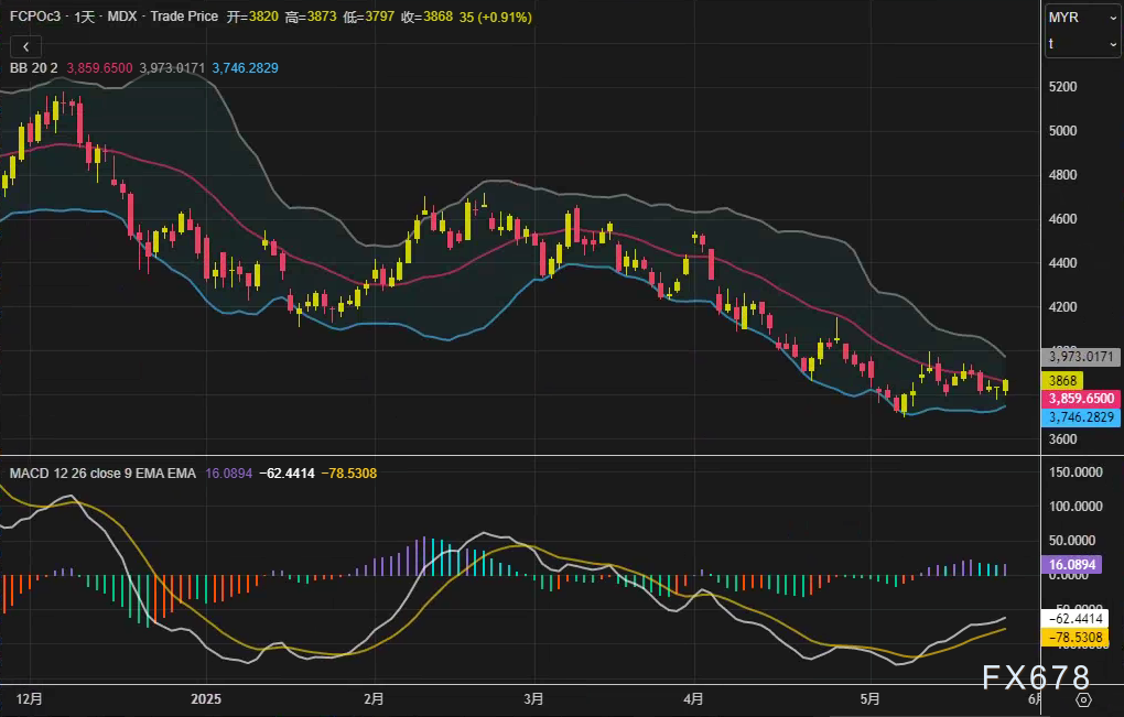 本周二(5月27日),尽管市场普遍预期马来西亚棕榈油产量及库存将延续增长态势,但BMD棕榈油主力合约FCPOc3仍逆势收高。截至收盘,8月合约报3868林吉特/吨,单日涨幅0.91%,实现三连阳。技术面显示,布林通道中轨位于3859林吉特,MACD柱状图虽仍处负值区间(-78.5),但快慢线收敛迹象明显,短期或延续震荡格局。