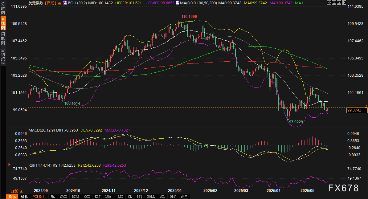 周二(5月27日)欧洲时段,美元指数(DXY)交投于99.30附近,较前一交易日五周低点98.70反弹0.40%。此次回升主要受美债收益率下行及市场对特朗普政府财政政策的观望情绪驱动。然而,美元仍处于关键均线系统下方,50日、100日及200日均线分别位于101.09、104.04和104.18,中长期空头格局未变。