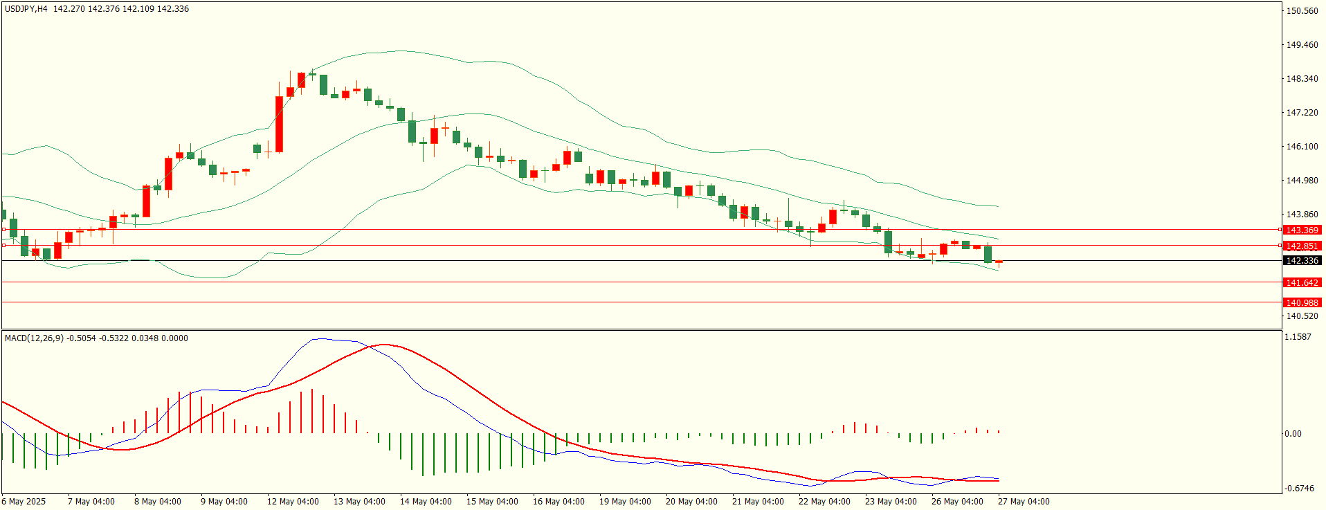美日昨日反弹至第一阻力上方承压下行,尾盘时段陷入窄幅整理,日线报收上下影线小阳线,收盘位置触及前支撑区,失守后方可继续,从4H来看,布林中轨偏下,MACD零轴下方运行,日内上方首要阻力142.85,第二阻力143.35,下方支撑141.65,140.95,保持在第一阻力下方短线有望测试第一支撑。