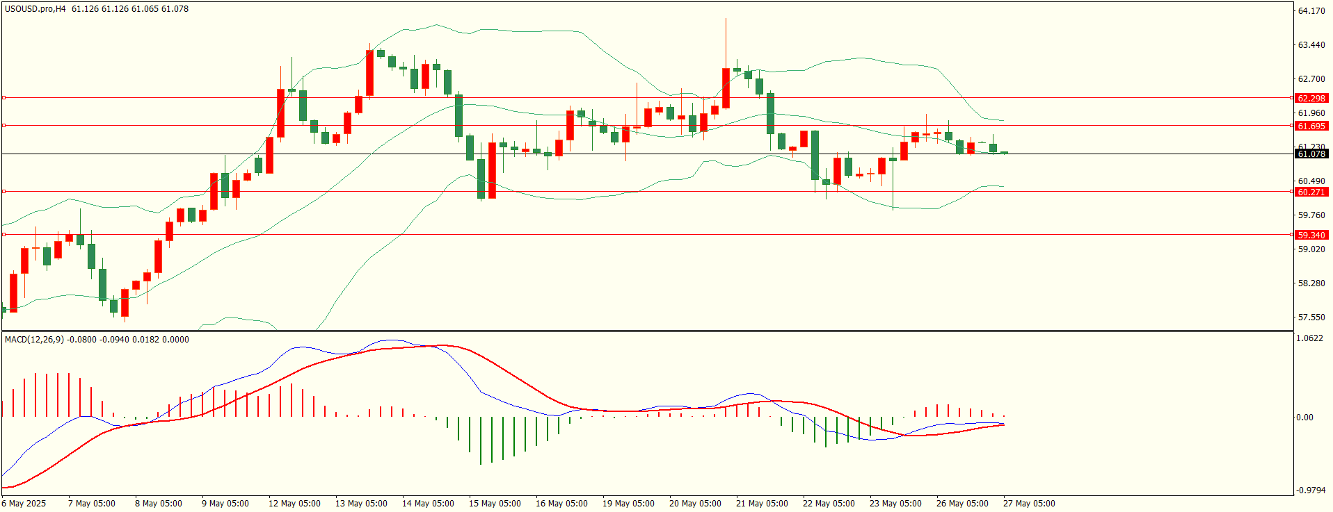 原油昨日反弹至第一阻力下方承压下行,纽约盘时段回落至第一支撑略有反复,日线报收上下影线小阴线,上方阻力犹存,短线略有偏空,从4H来看,布林中轨偏下,MACD零轴下方运行,日内上方首要阻力61.60-70,第二阻力62.20-30,下方支撑60.25,59.30-40,保持在第一阻力下方短线有望测试第一支撑。