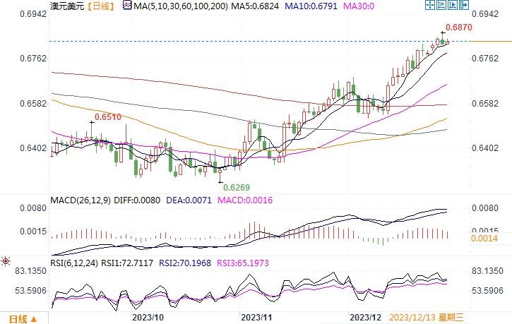 周四(12月28日),澳元/美元在亚洲交易时段一度触及五个月以来的高位0.6871,但在纽约尾段由于油价和铜价下跌抑制了澳元/美元的走势,最终收盘于0.6829。近期美澳两国明年降息幅度的预期,左右着澳元/美元的走势。期货走势暗示美联储明年将降息158个基点,而期货市场走势暗示澳联储2024年全年则相对温和地降息61个基点。这种降息预期推动债券价格大幅上涨,澳洲三年期公债期货达到 6月初以来的最高点96.490,隐含收益率为3.51%。澳洲面临的下一个重大考验因素将是1月15日公布的11月份消费者物价数据。分析师认为,由于基数效应等原因,消费物价同比升幅有可能从10月份的4.9%大幅放缓至4.1%左右。11月升幅放缓将暗示整个第四季度的通胀率将低于澳洲央行预测的 4.5%,并降低澳洲央行在2月6日举行的明年首次会议上恢复紧缩政策的风险。从而或有可能对澳元近期的升势有所阻碍。日线图上,5、10和21日均线呈看涨排列,但开始有超买状态显现,短线须防范下行整理的风险。下方支撑位在10日均线0.6794,若跌破将增加下行压力。