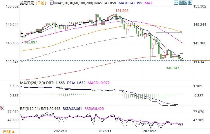 周四(12月28日),美元兑日元盘中低见140.27,为7月28日以来最低,收盘阶段下跌0.28%,报141.42。隔夜日元的表现,推动其走势的因素是投资者似乎在结清空头头寸,尤其是日元等热门融资货币的空头头寸。做空融资货币的投资者正在回补空头头寸。今年的市场题材是,美联储收紧货币政策,日本央行则是调整收益率曲线这样的小打小闹。明年情况将发生逆转,市场预计日本央行将加息,美联储将降息。基本驱动因素将发生变化。美国商品期货交易委员会(CFTC)的数据显示,截至12月19日当周,日元/美元净空头合约降至64,902手,而前一周为81,131手。随着通胀率超过2%的目标已有一年多的时间,许多市场人士预计日本央行将在明年加息,一些人认为最早可能在1月采取行动。美日两国明年利率前景的预期变化,将成为影响美元/日元走势的主要影响因素。图表显示的信号不一,一目均衡转换线和基准线呈水平,5日、10日和21日移动均线下行,同时动量指标筑底, 转换线142.61和本周高点142.83是初步阻力位,隔夜纽约时段所及12月低点140.27是主要支撑位。如果收在140.27下方,目标将是139.56,即2023年上涨走势的50%回档位。