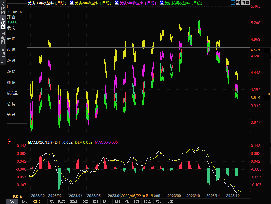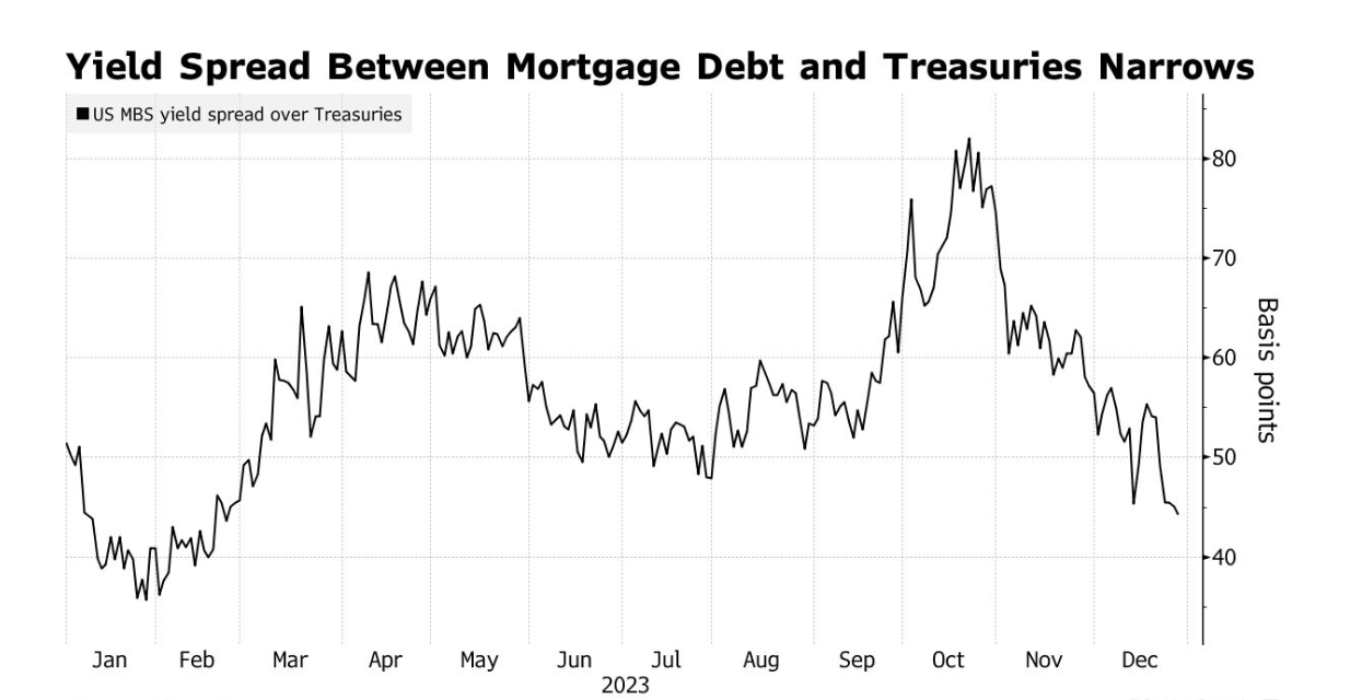 在全球央行明年可能降息的预期下,全球债券市场近期有望实现两个月来的最大涨幅。美国抵押贷款支持证券、美债以及法国和德国的政府债券是推动彭博全球综合债券指数在11月和12月上涨的主要因素。数据显示,作为全球资产定价之锚的10年期美债收益率,已较10月份的峰值下跌约120个基点,目前稳定在3.81%的水平。