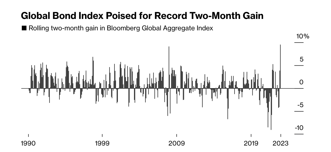 在11月和12月,追踪全球政府和企业债回报率的彭博全球综合债券指数实现了近10%的涨幅,这是该指数自1990年创立以来的最佳表现。随着市场对政策制定者可能采取行动的预期增强,围绕经济衰退的担忧情绪正在蔓延。交易员们普遍认为,明年可能需要大幅降息以刺激经济增长,这也进一步强化了持有债券的理由。