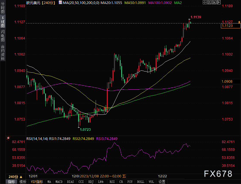 周四(12月28日),欧盘时段,欧元/美元窄幅震荡,盘中报1.1126/27,涨幅0.21%。这是欧元/美元连续第三周上涨。期货方面,欧元主力交投于1.1160,涨幅0.20%。