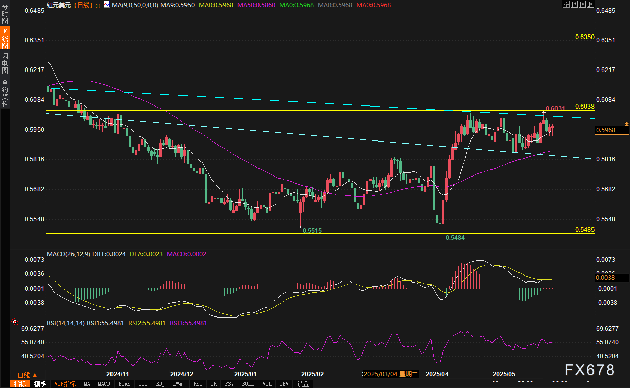 从日线结构观察,纽元兑美元自5月中旬以来持续在0.5830-0.6000区间构筑矩形整理形态,当前价格紧贴9日均线(0.5950)运行,该位置与矩形下轨共同构成双重支撑: