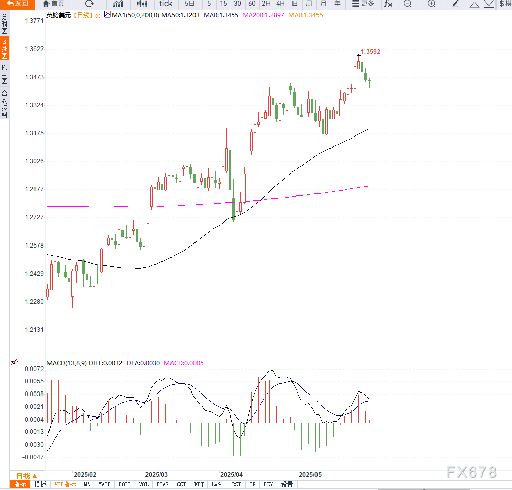 若跌破此位置,可能引发进一步下探至1.3350及1.3300区域。而上方初步阻力在1.3500关口,若成功突破,或将迎来一轮技术性反弹,但整体趋势依旧偏空。日线MACD指标死叉运行,RSI维持在中轴下方,表明当前空头仍掌控主动。