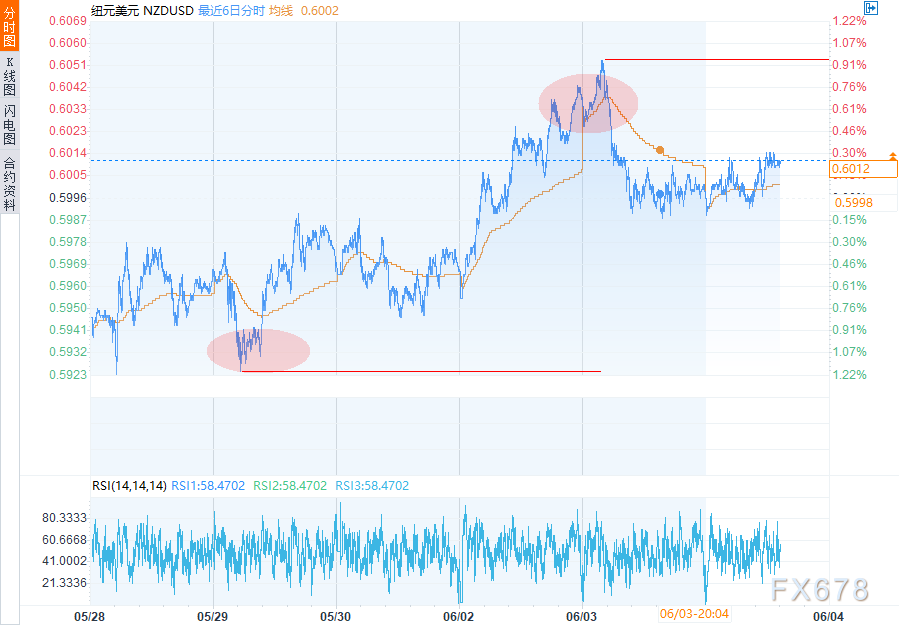 周三(6月4日)欧盘时段,纽元/美元分时图上价格有明显波动,呈现多波上涨与回调。均线在 0.6011 附近,相对平稳。