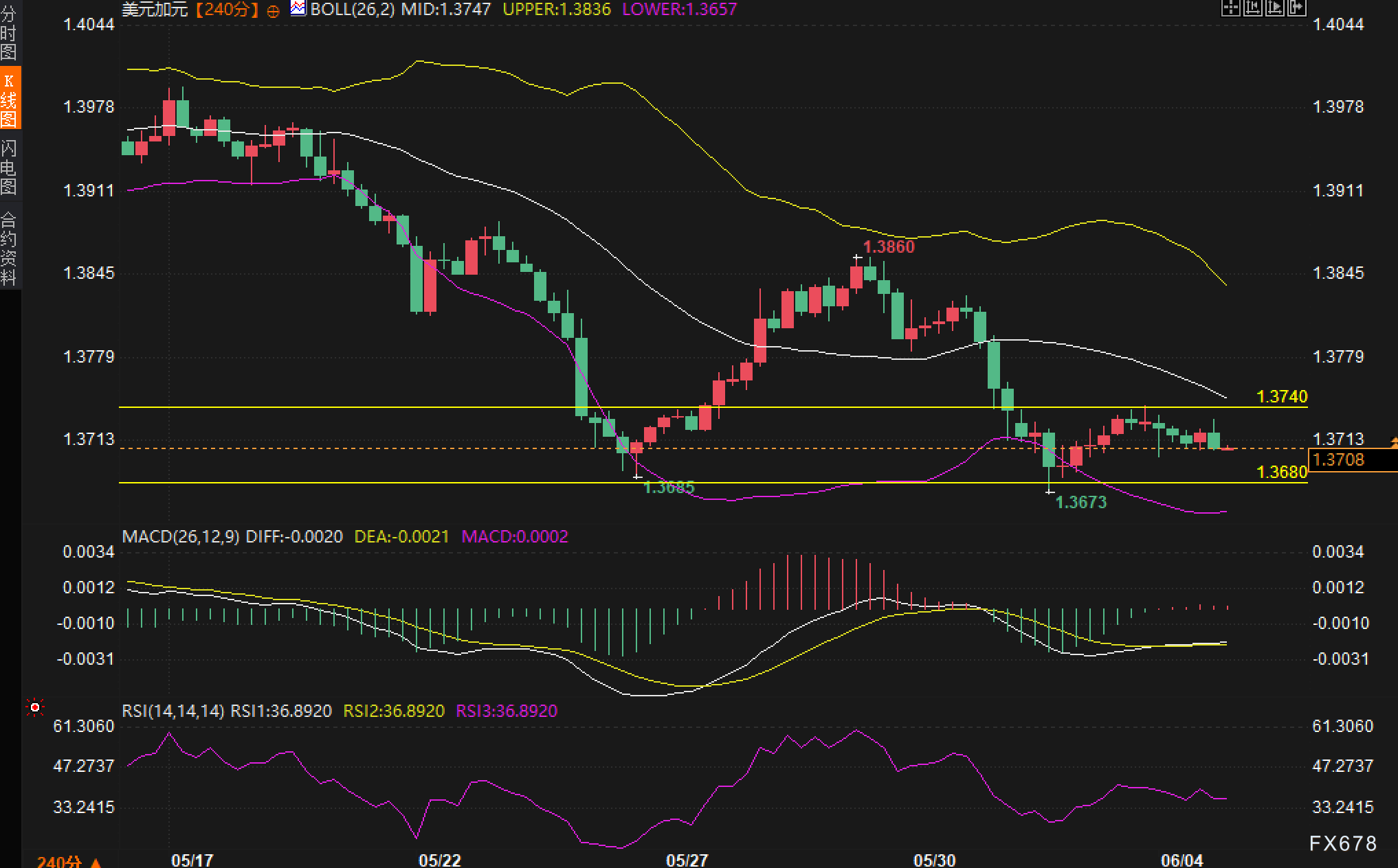 从美元兑加元4小时K线图来看,汇价近期自1.3860高点连续回落,最低探至1.3673后止跌企稳,进入震荡整理阶段。当前布林带逐渐收敛,显示波动率正在压缩,暗示行情有望迎来方向性选择。