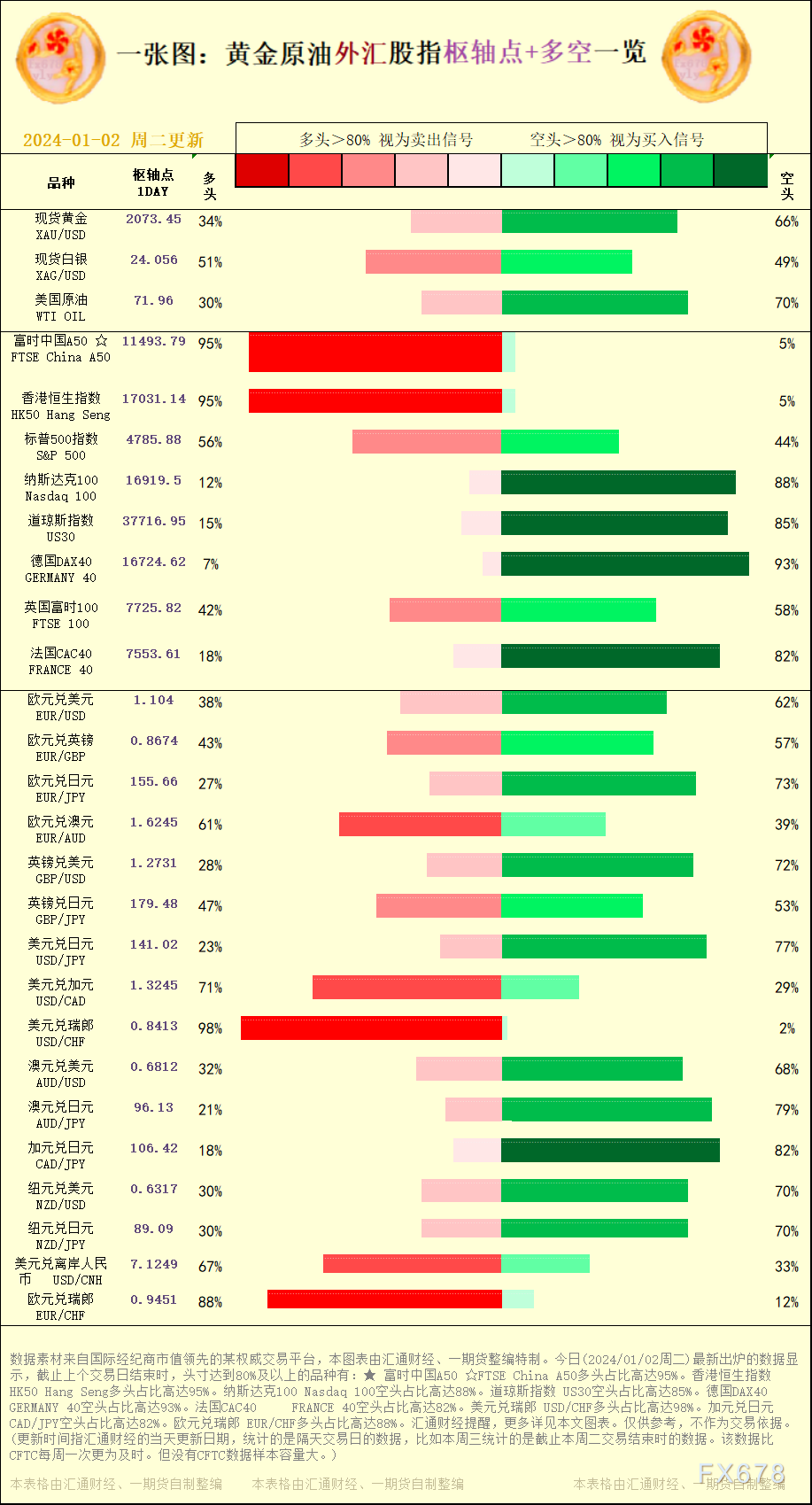 一张图:黄金原油外汇股指"枢纽点+多空占比"一览。今日(2024/01/02周二)最新出炉的数据显示,截止上个交易日结束时,头寸达到80%及以上的品种有:★ 富时中国A50 ☆FTSE China A50多头占比高达95%。香港恒生指数 HK50 Hang Seng多头占比高达95%。纳斯达克100 Nasdaq 100空头占比高达88%。道琼斯指数 US30空头占比高达85%。德国DAX40GERMANY 40空头占比高达93%。法国CAC40FRANCE 40空头占比高达82%。美元兑瑞郎 USD/CHF多头占比高达98%。加元兑日元 CAD/JPY空头占比高达82%。欧元兑瑞郎 EUR/CHF多头占比高达88%。汇通财经提醒,更多详见本文图表。仅供参考,不作为交易依据。