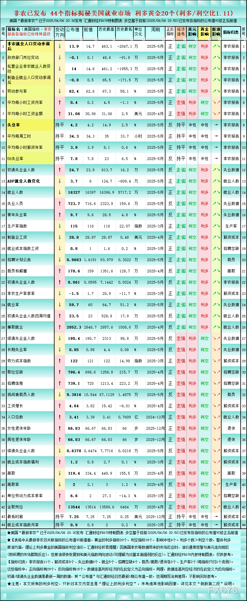 【(上图:非农已发布 44个指标揭秘美国就业市场 利多黄金20个(利多/利空比1.11) 来源:汇通财经FX678特制图表 本图多空基于目前(截止2025/06/06 20:30)非农夜已出炉的最新美国非农的公布值VS前值的比较结果。