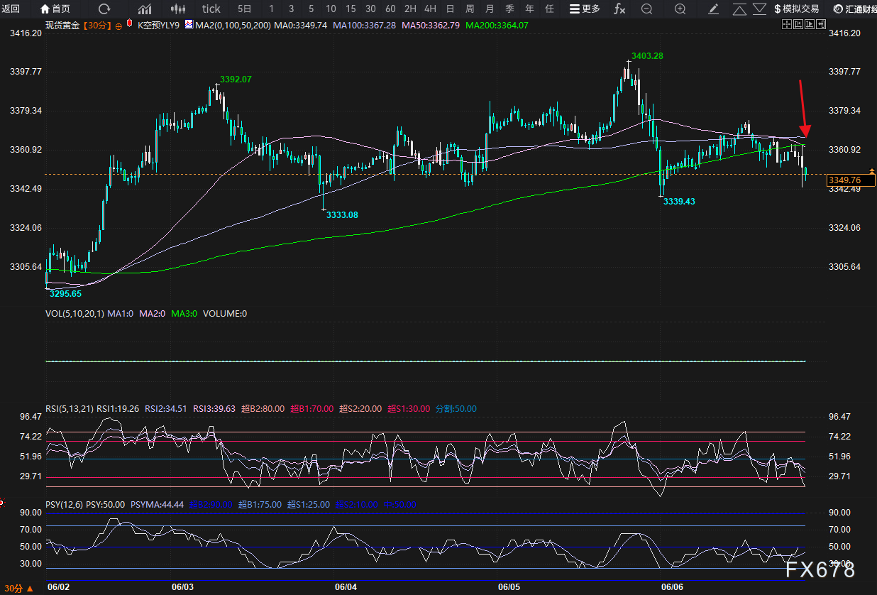 黄金技术面受压情况,关键在30分钟的200周期均线,且在3363-3368区域有较密集阻力带。因此朝下试探3340的压力更大。详见下图