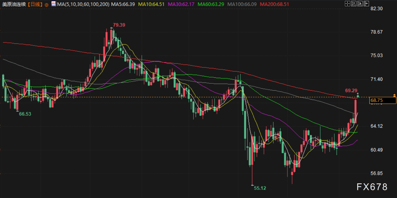 布伦特原油期货收高4.34%,至每桶69.77美元。美国原油上涨4.88%,至68.15美元。布伦特原油和美国原油均创下 4 月初以来的新高。