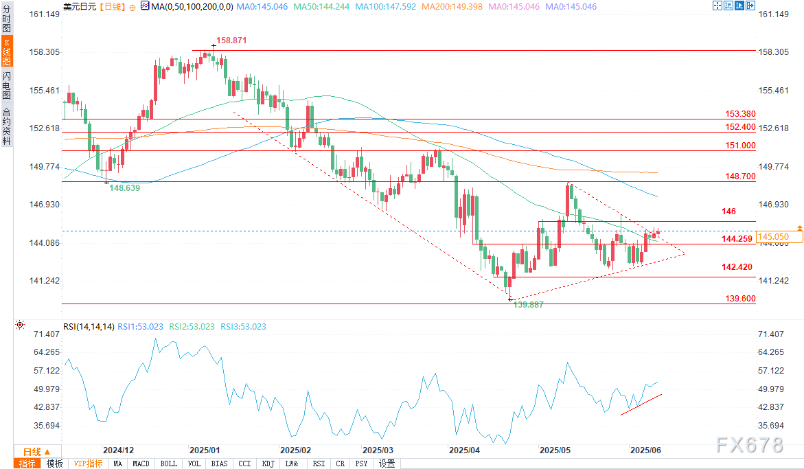 周三(6月11日),美元/日元当前价格在144.9-145.2区间波动,较开盘有一定上涨,突破部分短期阻力,但145.3附近存在前期压力。整体看,短期偏多但超买信号隐现。