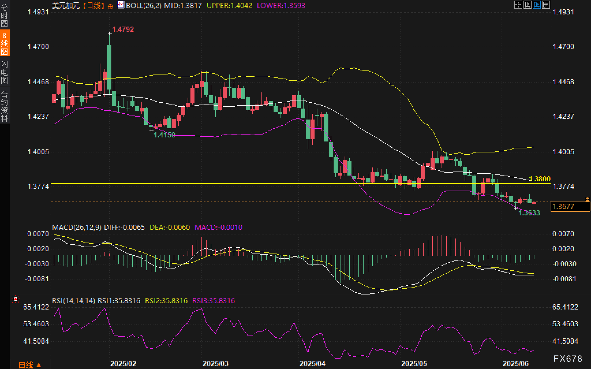从日线图观察,汇价自3月中旬以来呈明显的下降趋势,目前位于布林带下轨附近盘整。当前布林带指标中,布林中轨位于1.3817,布林下轨在1.3593,显示波动率略有收敛,技术面短线仍偏空。