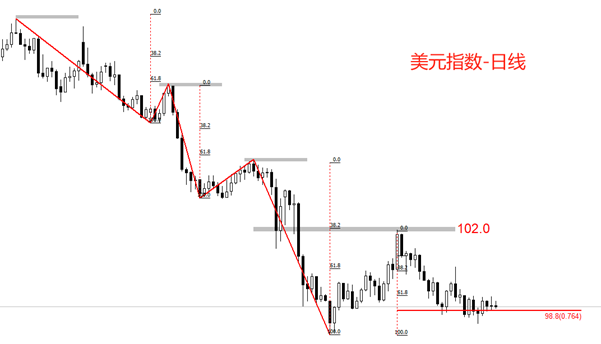 技术走势看,日线级别,美元指数处于空头趋势之中,最新波段为下跌。最近三周,美元指数呈现出小幅横盘震荡特征,震荡中枢在前一轮上涨波段的0.764分位98.8位置。今日晚间的CPI数据将会对美元指数形成短线冲击,但一举突破震荡区间的可能性较低。考虑到美元指数趋势为空,所以窄幅震荡结束后行情延续跌势的概率较高。下一支撑位关注前期低点97.88点。