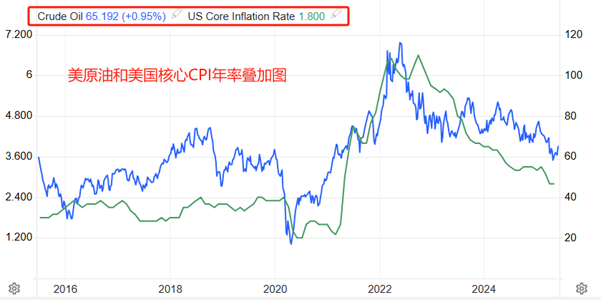 通胀率数据还和美原油价格走势密切关联。从美原油和美国核心CPI年率曲线的叠加图可以发现,两者基本保持同涨同跌的特征。因为原油价格影响几乎有所商品的运输成本,油价升高或者降低,将会对PPI和CPI产生直接影响。
