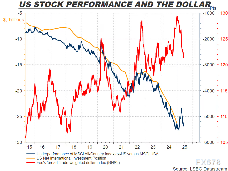 德意志银行的汇率研究团队进一步为这一讨论增添了新的视角。他们分析了全球持有海外资产最多的机构投资者(如北欧、荷兰、澳大利亚的养老基金和保险公司)的投资行为,发现这些机构的投资组合中有超过50%的资产配置在美国市场,而日本和瑞士的机构也有高达30%以上的美国资产敞口。