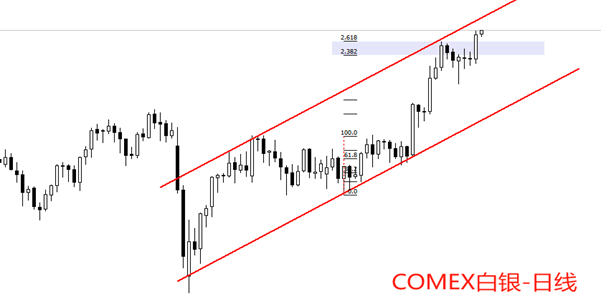 走势结构角度看,日线级别,COMEX白银处于中期多头趋势,最新波段为上涨。黄金分割角度看,白银最新市价刚刚脱离2.382~2.618的强阻力区。由于昨日K线收盘价位于阻力区上方,可以认为阻力已经失效,白银涨势大概率会延续。