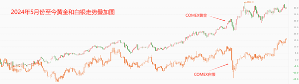 2024年以来,黄金进入疯涨阶段,历史最高价每月都在被刷新。2024年6月份,才开始创出阶段性新高,但每次创新高后,都会出现深幅回调。两种不同的走势特征,导致黄金的涨势远超同期白银。如上图所示,2024年5月份至今,白银的累计涨幅曲线一直处于黄金累计涨幅曲线之下。因为白银和黄金都具有避险属性,两者涨幅的差距大概率会在未来被弥补(也就是补涨)。昨日白银大涨而黄金横盘,就是两者涨幅差距被弥补的现象。
