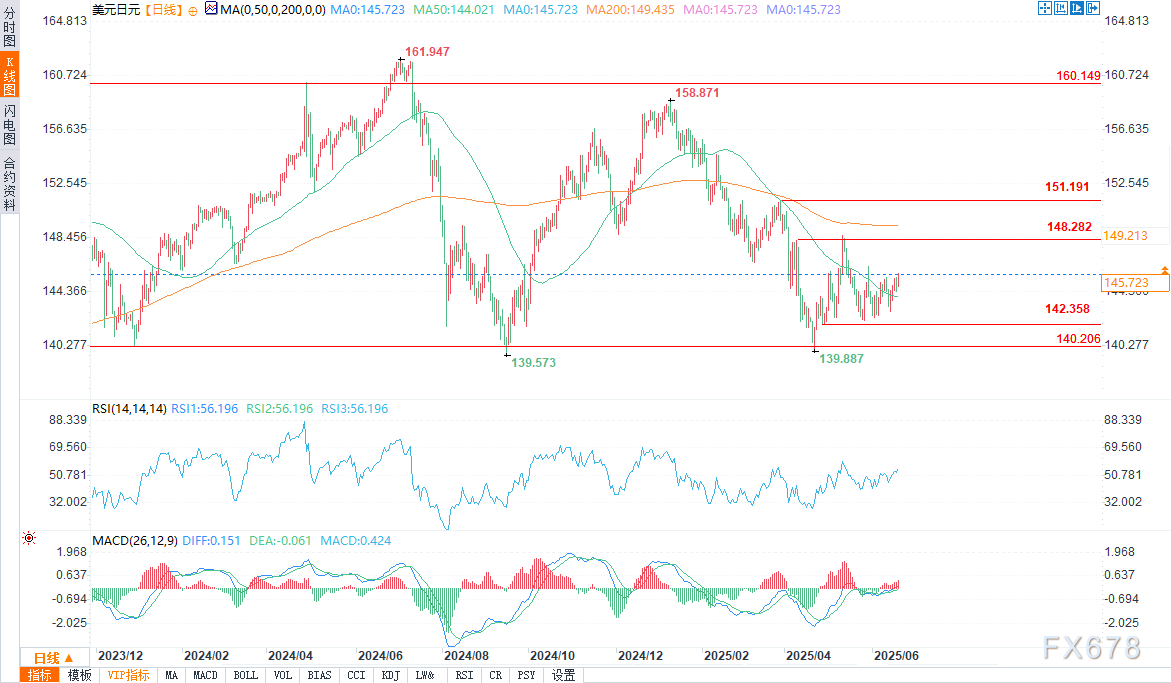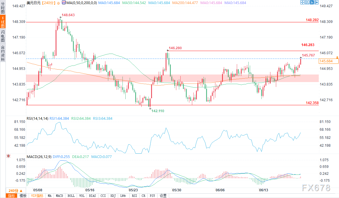 周四(6月19日)欧盘时段,美元/日元盘中交投于145.636/49,涨幅0.36%。地缘政治担忧推动市场,在当前的避险情景下,美元比日元表现更好,美元/日元日内保持走高趋势。