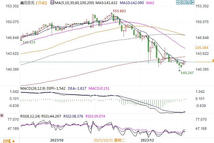 周二(1月2日),由于美债收益率大幅回升,美元指数上涨0.799%,创下10月以来的最大单日百分比涨幅。日元兑美元下跌0.75%,报141.98。美元指数在2023年下跌2%,结束了两年来的涨势,因投资者预期美联储年将大幅降息。虽然在上月美联储暗示将在2024年降息后美元承压,但有机构的分析表示,“市场逐渐认识到美国经济依然强劲”,而且今年可能保持强劲。因此,美联储是否真能如市场预期那般进入降息阶段,仍需做进一步的观察。投资者本周将看到多项经济数据,包括欧洲通胀数据、美国职位空缺和非农就业数据,这些数据将影响市场对美联储和欧洲央行货币政策动向的预期。美联储制定利率的联邦公开市场委员会(FOMC)将在周三公布12月会议记录,这将让人们进一步了解决策者对降息可能性的看法。若各方面显示,美联储尚不必要及早降息,那么美元势必将会进一步自上年的的低位进行反弹。日线图上,技术指标平滑异同移动平均线MACD的信号线出现死叉,相对强弱指数RSI也出现转向的迹象,表明美元/日元在140水平的支撑较为强韧。上方的初步阻力在143附近,若上穿,进一步将考验145的阻力情况。近期以防范美元反弹风险为主。