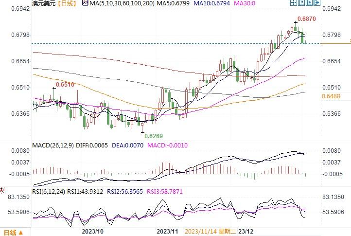 周二(1月2日),受美元大幅反弹的影响,澳元/美元大幅下挫了0.78%,收盘于0.6761。在澳洲国内,数据显示去年澳洲房价反弹了8%,但加息和负担能力的恶化在一定程度上减缓了去年最后几个月的增长速度。市场仍押注澳洲央行已经完成了货币政策紧缩,下一步就是降息。若息差优势渐失,澳元或就会难以获得走升的支撑。技术图形上,澳元/美元升势停滞,5日移动均线已向下穿过10日移动均线,支撑位在21日均线0.6722,跌破后将确认上升趋势结束,10日均线0.6806现在是阻力位。下方若跌破0.6720,则目标或将指向10月/12月涨势的38.2%回档位0.6641,只有突破0.6810可能才会重燃短期走高趋势。