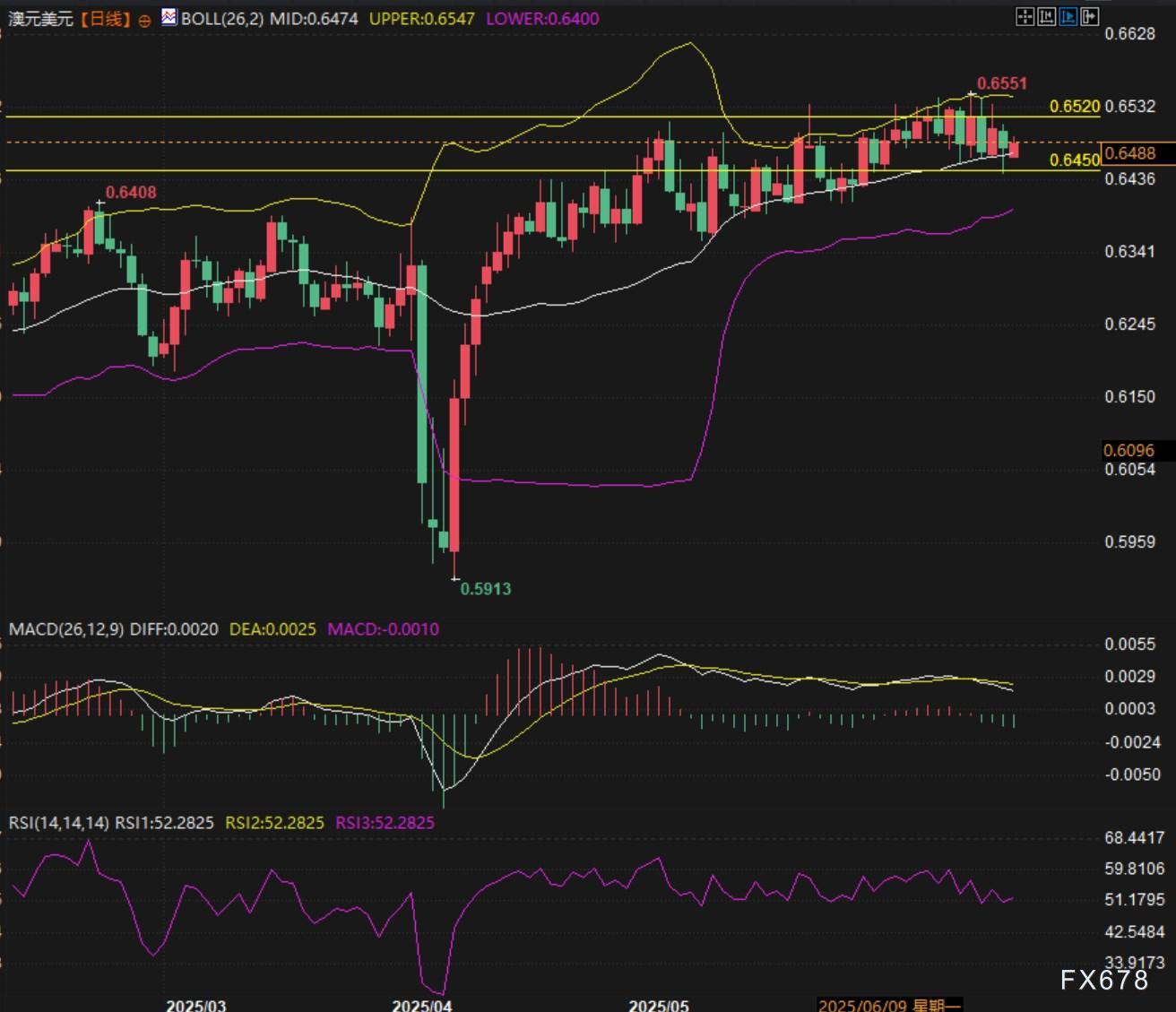 技术面角度分析认为,预期汇价将继续向0.6520-0.6550区域推进。如果成功突破0.6547的布林带上轨,下一目标位可看向0.6600关口。