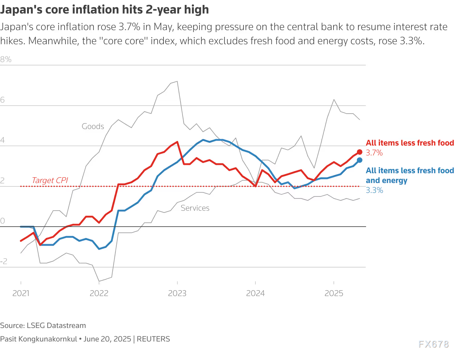 日本经济正站在一个关键的十字路口。周五(6月20日),日本公布的5月核心消费者物价指数(CPI)数据揭示了一个令人瞩目的现实:核心通胀率创下逾两年新高,达到3.7%,不仅超出了市场预期的3.6%,也远高于日本央行2%的目标。这一数据引发了市场对日本央行加息政策的热烈讨论。与此同时,美国关税政策的不确定性和中东地缘政治紧张局势为日本经济蒙上了一层阴影,而日元的走势也因此备受关注。