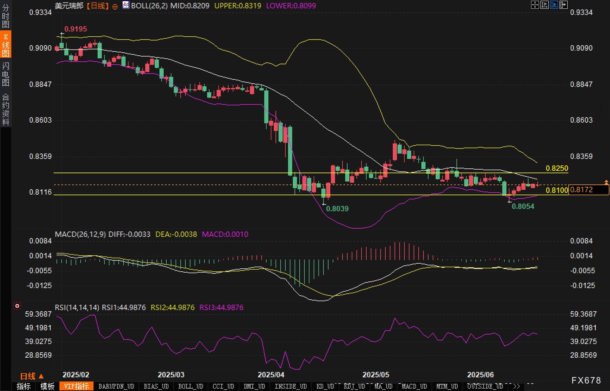 短期展望来看分析认为,若汇价能持续守稳0.8100–0.8050支撑带,且配合技术指标转强,则不排除展开技术性反弹,首个上行目标位看向0.8250,进一步关注布林上轨0.8319。但若0.8050一线失守,则美元/瑞郎可能重新步入下降趋势,考验年内低点。