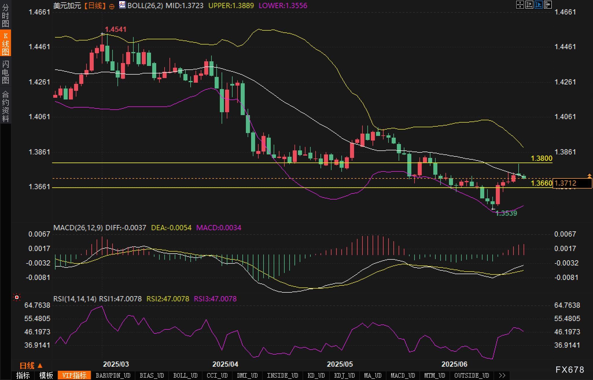 短期展望:分析认为短期内,汇价若站稳1.3723上方,则将挑战1.38甚至布林上轨1.3889的阻力区域。该区域为此前震荡平台的顶部,若能放量突破,将打破中期盘整格局,重启升势。