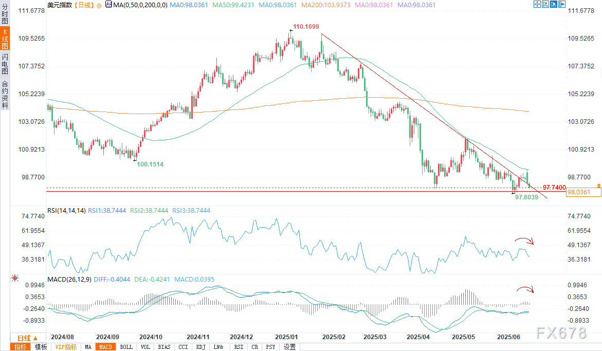 周二(6月24日)欧盘时段,美元指数整体呈下行趋势,跌破关键支撑位,弱势特征明显,短期空头力量主导。