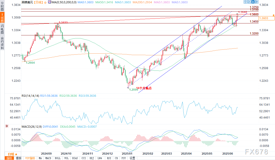 周三(6月25日)欧盘时段,英镑/美元盘中冲高至1.3633后回落,不过仍维持在1.36上方。昨日,英镑/美元触及1.3648,为2022年2月以来的最高水平。