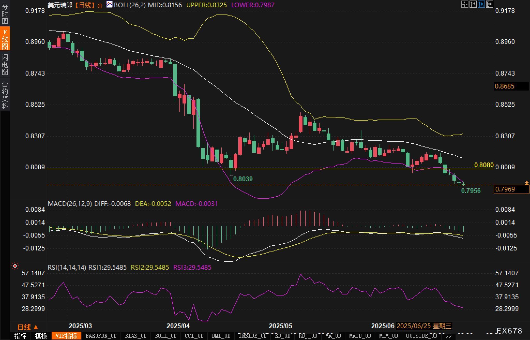 日线K线图显示,美元/瑞郎自今年3月以来维持明显下降趋势,价格持续运行在布林带中轨下方,目前布林带开口保持扩张,表明波动率依旧高企。上周五录得的最低点0.7956已跌破前期低点0.8039一线,日内仍在该区域下方弱势整理,表明短期空头力量占据主导。