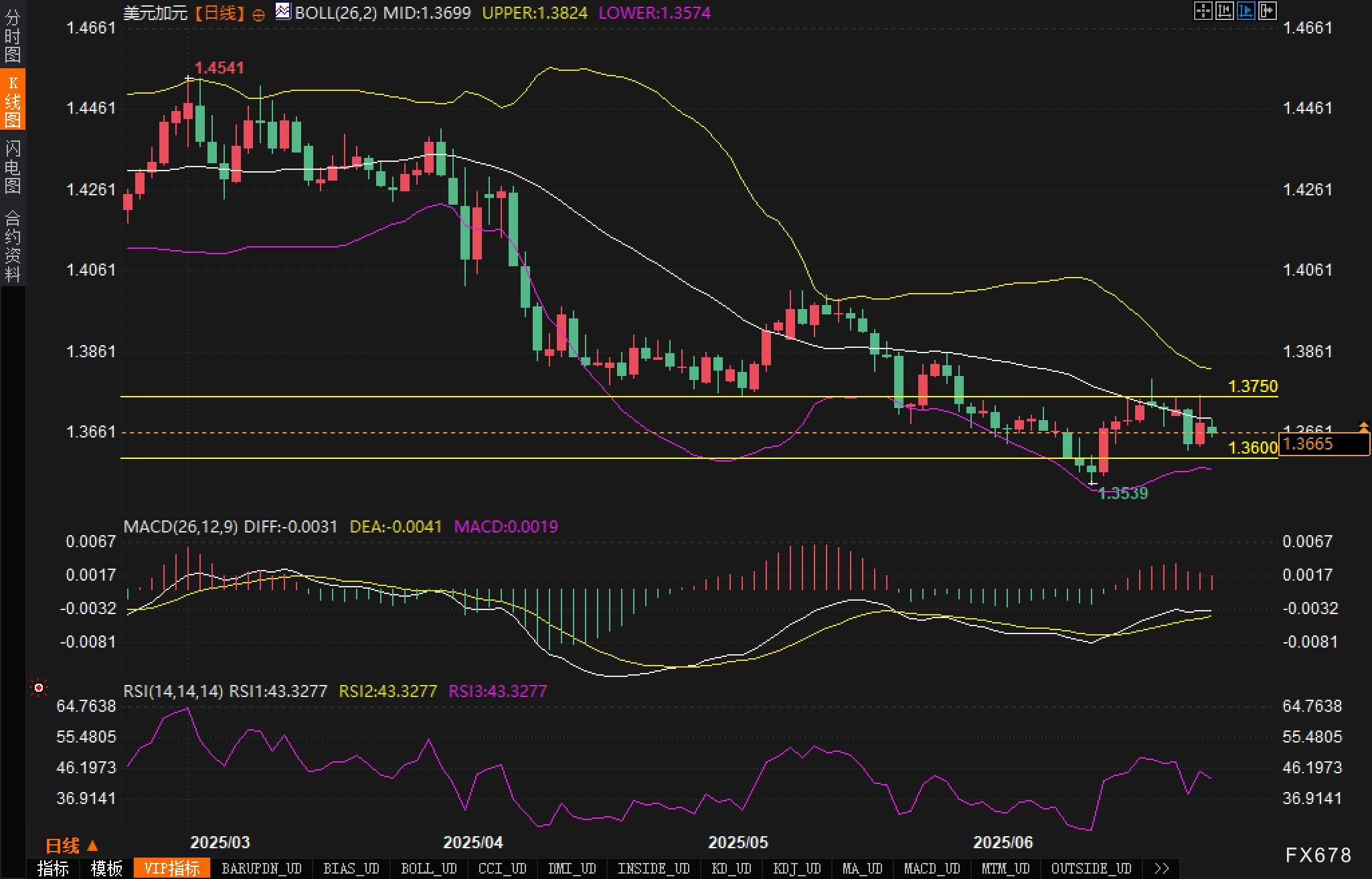 从日线图来看,美元兑加元自1.4541高点回落后,整体保持在一个明显的下降趋势中。布林带指标显示布林中轨(1.3699)成为汇价的短期压制,布林带口径略微收敛,暗示波动率正在降低。汇价近期在1.3600附近获得支撑,形成关键水平,分析认为若跌破或引发进一步的下行空间,目标或指向布林下轨1.3574及前低1.3539。