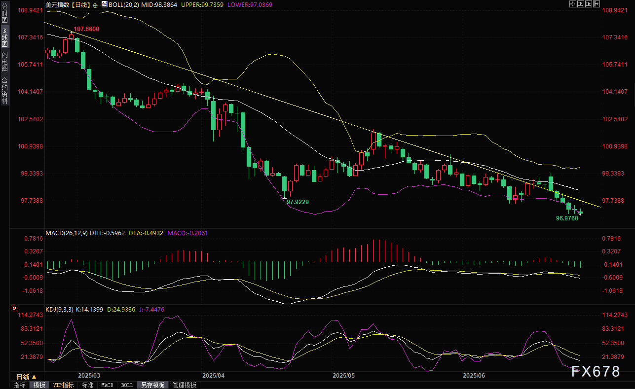 周一(6月30日)亚欧时段,美元兑欧元、英镑、瑞郎等主要货币徘徊在多年低点附近。市场对美国贸易协议的乐观情绪不断升温,叠加美联储降息预期的高涨以及特朗普对美联储主席鲍威尔的公开抨击,美元正面临多重压力,美元指数一度刷新2022年3月以来低点至96.98。
