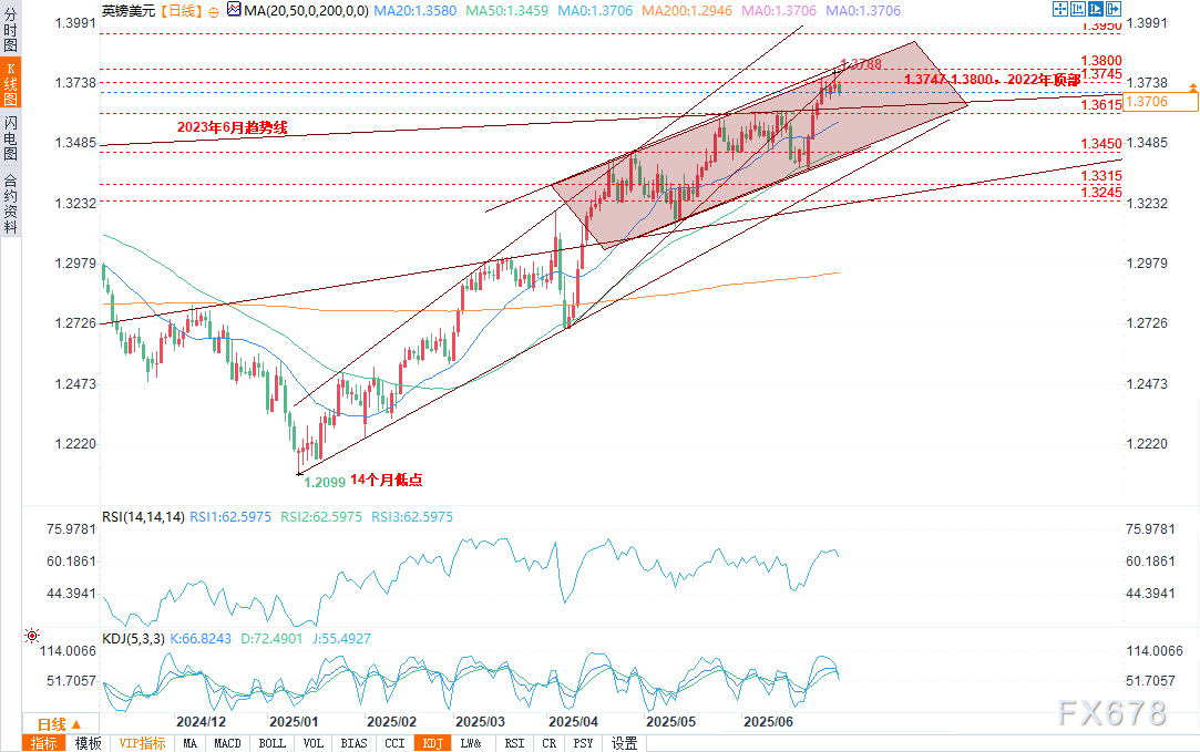 与此同时,相对强弱指数(RSI)和随机指标发出了超买预警,当前价格接近2022年高点1.3747以及看涨通道上轨。上涨趋势顶端出现的实体较短的K线也反映出交易员们一定程度的犹豫情绪。