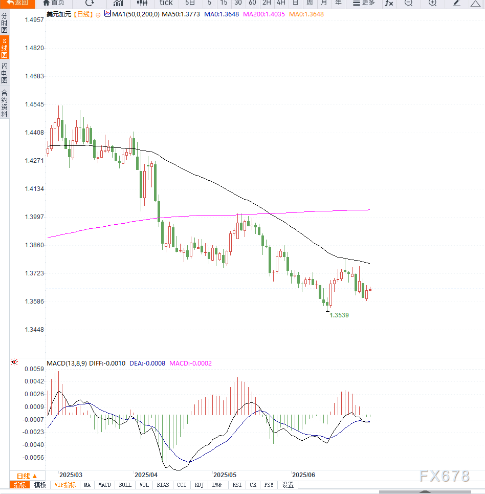 USD/CAD当前交投于1.3650附近,延续周二区间内走势,市场情绪明显谨慎。投资者普遍将目光投向即将于本周五公布的美国6月非农就业数据,以寻求美联储货币政策路径的进一步信号。