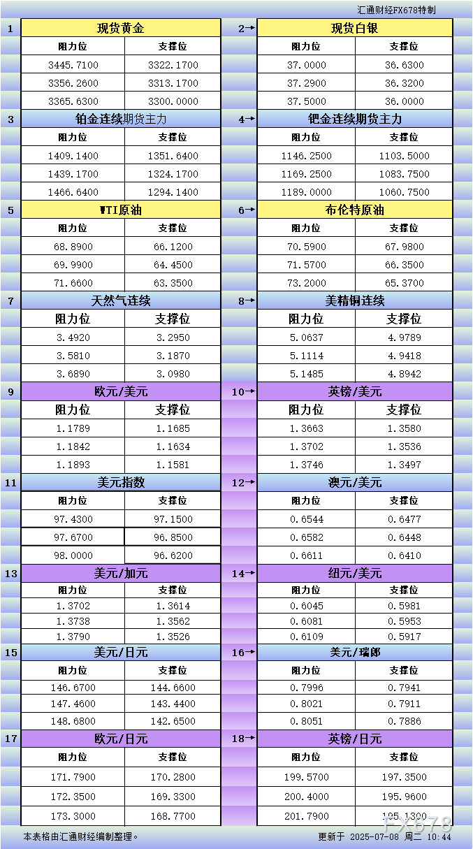 7月8日亚市更新的黄金、白银、铂金、钯金、原油、天然气、铜(商品)以及:美元指数、欧元、英镑、日元、瑞郎、澳元、加元、纽元(热门货币对)的支撑阻力位一览。