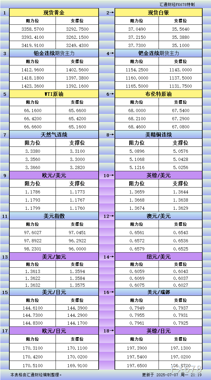 7月7日美市更新的黄金、白银、铂金、钯金、原油、天然气、铜(商品)以及:美元指数、欧元、英镑、日元、瑞郎、澳元、加元、纽元(热门货币对)的支撑阻力位一览。
