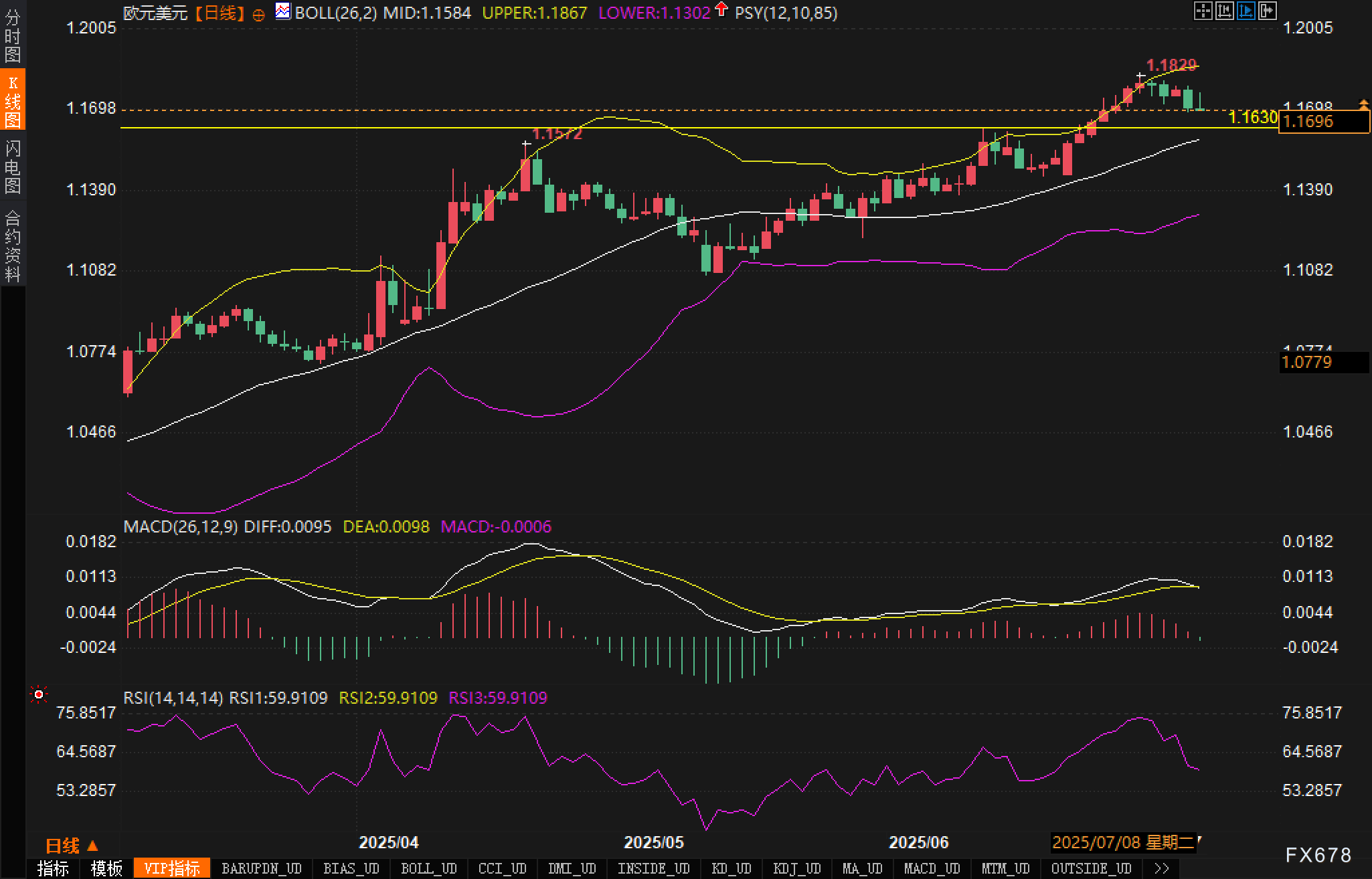 当前日线图显示,汇价近期在触及1.1829高点后出现回落,表明短期多头动能逐步减弱。布林带指标显示布林上轨(1.1867)未能被有效突破,价格持续贴近中轨(1.1584)上方运行,显示出震荡偏强的结构。