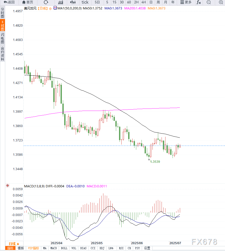 在美元高企、铜关税冲击与油价疲软的多重背景下,加元面临明显基本面压力,而USD/CAD则处于技术和情绪双重利好之中。短期内市场聚焦FOMC会议纪要内容是否强化“高利率更久”的基调,若纪要鹰派,则美元或进一步走强,推动USD/CAD突破当前区间,挑战更高目标位。