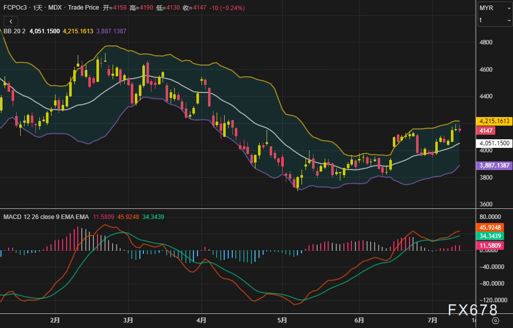周四(7月10日),马来西亚衍生品交易所(BMD)棕榈油主力合约FCPOc3收报4147林吉特/吨,日内下跌0.24%,结束此前三连涨。日线级别MACD指标呈现11.58的柱状线,快慢线间距收窄至34.34,布林通道中轨位于4051林吉特,显示市场正面临方向性选择。