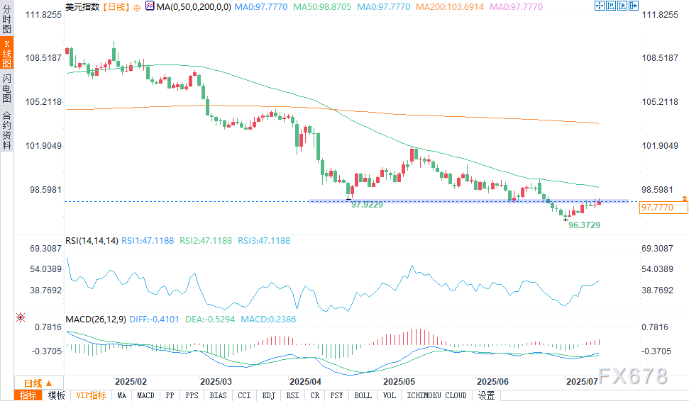 美元指数图表显示,价格从7月低点96.377反弹,目前正测试97.90–98.00区间,接近50日移动平均线(SMA)所在的98.90关口,该位置仍是短期阻力位。
